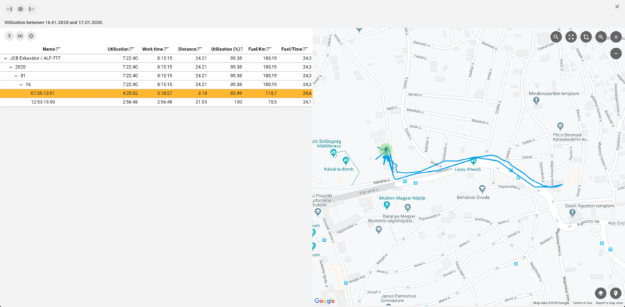 The query determines the degree of utilization by comparing the duration of a given work day with the duration of the effective work. In terms of the query, the working day means the time spent between the reception of the first ignition coordinate and the reception of the last ignition coordinate on the day. The time spent with effective work is calculated by summing the periods indicated via the digital input used for this purpose. In the light of this information, the utilization rate of a given machine or vehicle during the reviewed period can easily be calculated.