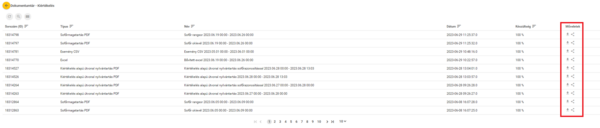 A letöltés egységesen, az összes dokumentum fajta esetében a lista jobb oldalán elhelyezett lefelé mutató nyíl ikonnal indítható. Amennyiben az oszlopban nem a nyíl ikon szerepel, a dokumentum feldolgozási hiba miatt nem letölthető.