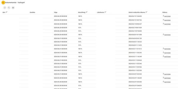 Erről a felületről érhető el az összes tachográf adatletöltés. Az Adminisztráció Tachográf funkciójában elindított adatletöltések eredményei jelennek meg időrendi sorrendben, kereshetően, listázva.