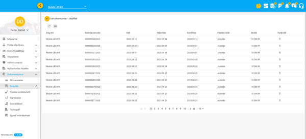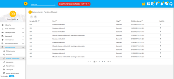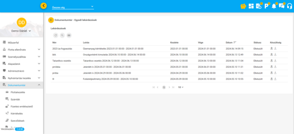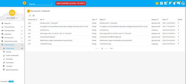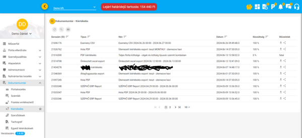 Ebben a menüpontban érhetőek el és tölthetőek le a felület különböző funkcióiban elindított adat exportok (az Eszközök és Járművek funkciókban, valamint az Események funkcióban indított exportok kivételével). Ezenkívül a szerződések, számlák, tachográf letöltések és a többi modul funkcióiban feltöltött csatolmányok (számlák, stb.) szintén itt, a Dokumentumtárban találhatóak meg.
