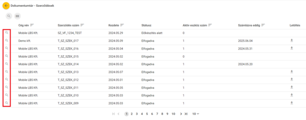 A táblázat soraiban található nagyító segítségével a szerződésbe foglalt összes eszköz listáját láthatjuk.