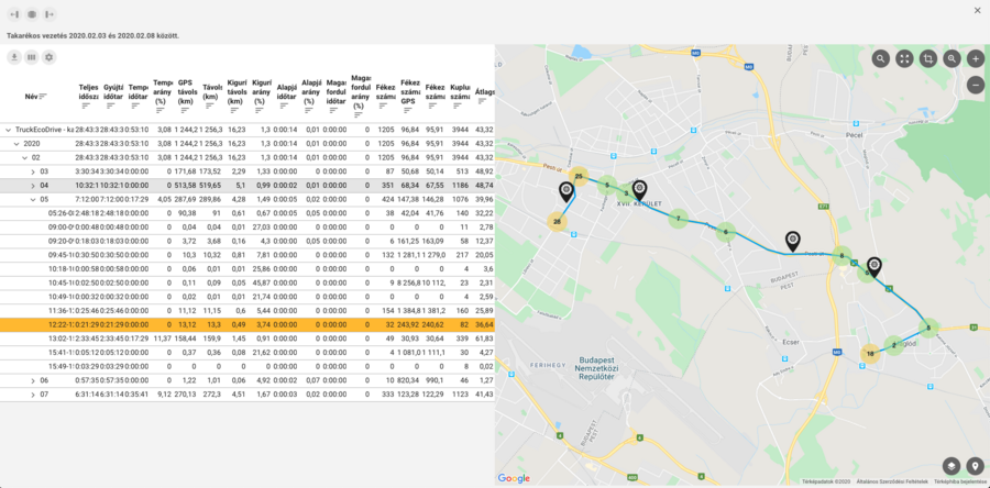 A táblázatban akár egy kiválasztott szakaszra, akár egy több szakaszt magába foglaló időszakra kattint a felhasználó, a térképen megjelenik az útvonal. Az útvonalon megjelennek a fékezéseket és kuplungolásokat jelző bóják, melyek a nagyítási szinttől függően csoportba rendeződnek. A csoportra kattintva a térkép ráközelít és kibontja a bójákat.