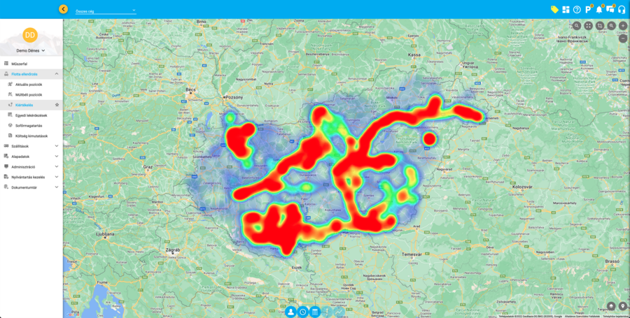 Ez a funkció nem egy kiválasztott útvonal vagy szakasz részletes vizsgálatára alkalmas, hanem nagyobb mennyiségű útvonal, magas megtett kilométerszám vizualizációjára. A hőtérkép segítségével egy pillantás alapján megállapítható hogy milyen útvonalakon közlekednek a rendszerbe tartozó járművek vagy eszközök a leggyakrabban, a térképes nézet távolításával pedig lehetőség nyílik a gyakran látogatott főutak, autópályák, vagy akár települések, országrészek áttekintésére is.