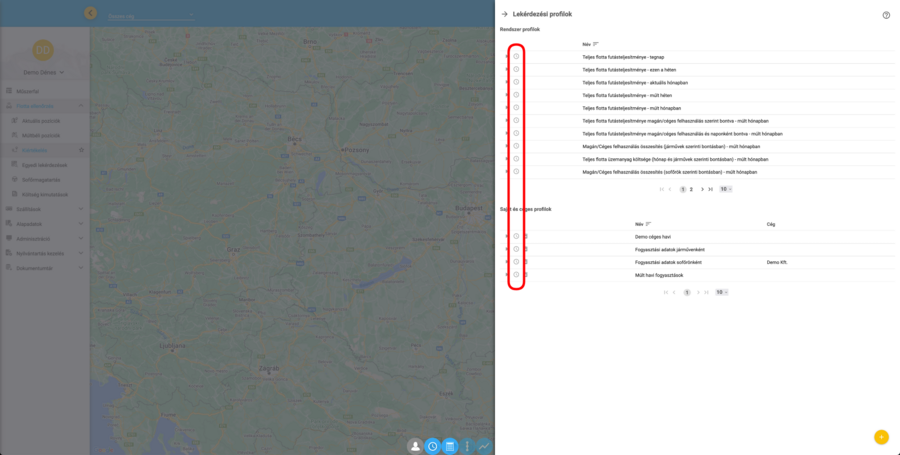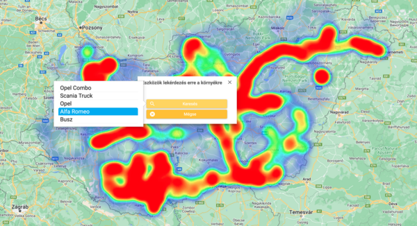 A lekérdezés ide gombra kattintva felnyíló ablakban a keresésre kattintva a rendszer egy felugró listában megjeleníti a kattintás helyén a lekérdezett időszakban megforduló járművek nevét.
