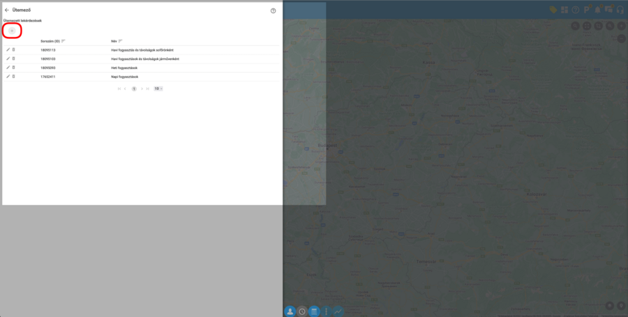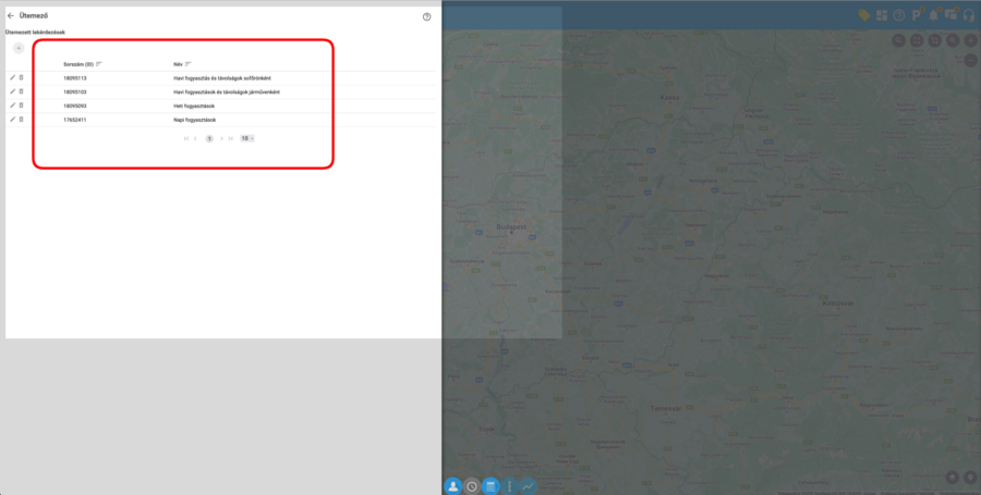 Az ütemező ablakban a létrehozott ütemezések listája található, az ütemezések bal szélén az ütemezés módosítására szolgáló ceruza ikon és a törlésére szolgáló szemetes ikon, jobbra mellette az ütemezés neve látható.