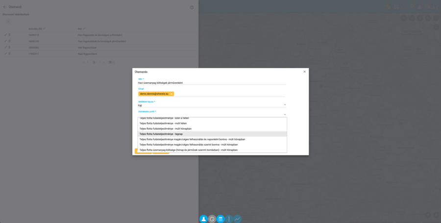 Kényelmi funkcióként a rendszer és felhasználói lekérdezések eredményeiből készült adatexportok ütemezetten is kérhetők. Az ütemező a képernyő alján elhelyezett dokkra kattintva nyílik meg.