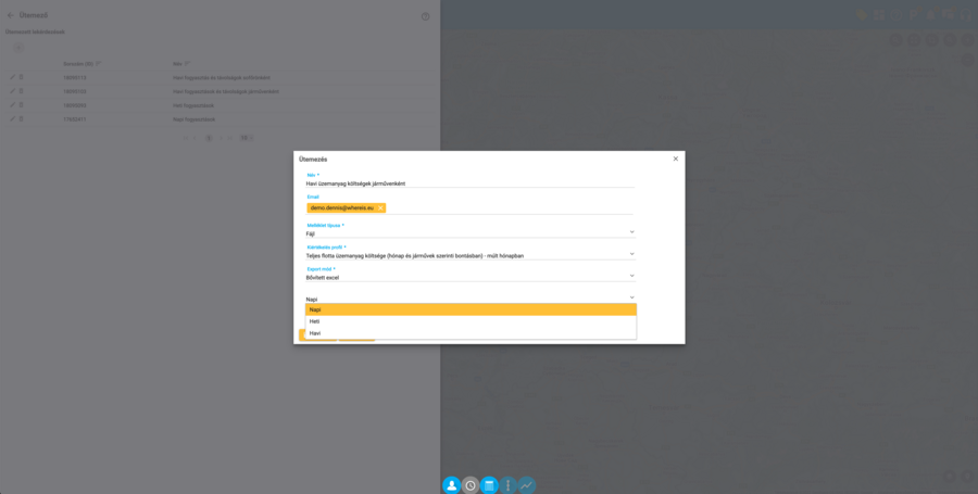 Napi gyakoriság esetén 1-31 naponként kérhető, heti gyakorisággal a hét tetszőleges napja választható ki, havi gyakoriság beállításakor az választható ki, hogy a hónap mely napján készüljön az export.