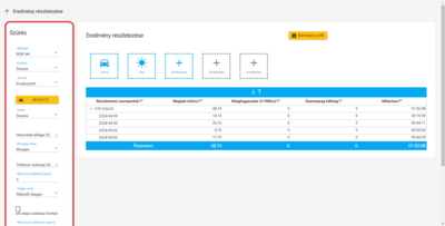 Az ablak bal oldalsávjában található a Szűrés, a rendszer az itt beállított paraméterek által meghatározott tartományból aggregálja az adatokat, az eredmény (azaz a riport) az ablak jobboldali táblázatában jelenik meg. A Szűrésben megadott paraméterek meghatározzák a lekérdezés idejének intervallumát, a figyelembe vett eszközök, járművek és sofőrök körét, a használati módot, a mozgás/állás vizsgálatát és végül a kiértékelési mutatószámokat, melyek megjelenítése az eredmény táblázatban oszloponként ki- illetve bekapcsolható.