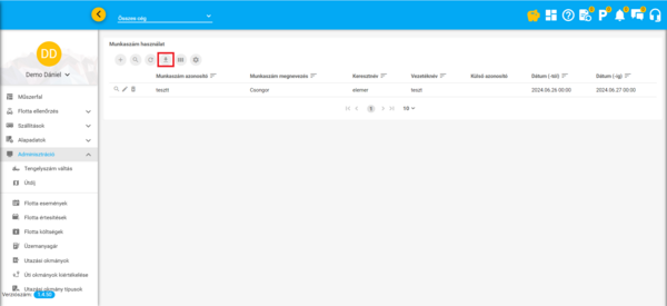 A lista dátumtól dátumig, egy-egy konkrét munkaszámra, partnercégre, valamint személyekre és járművekre szűrhető, az oszlopfejlécekre kattintással sorrendezhető. A lista alatt lapozó elem található.