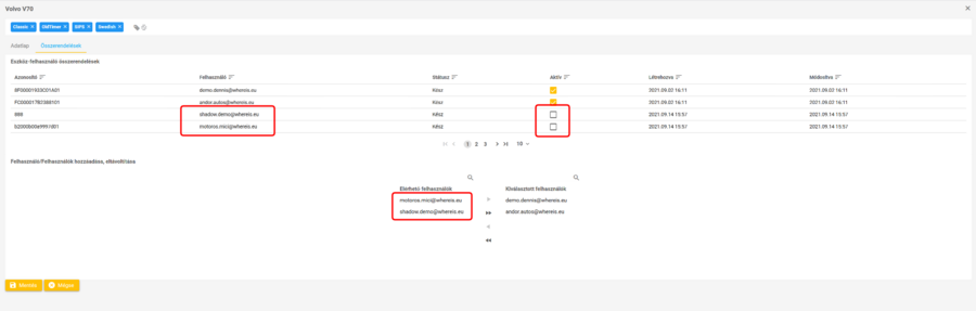 Az összerendelés felület felett látható az összerendelések listája, itt az is látható hogy a jogosultság aktív állapotban van-e vagy sem. Inaktív jogosultsága olyan felhasználónak lehet, akinek már volt jogosultsága az adott eszközhöz sofőrazonosításra, de valamely okból ezt a jogosultságot azóta megvonták tőle.