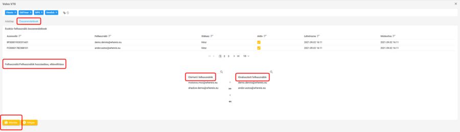 Az eszközt módosításra megnyitva az Adatlap mellett található az Összerendelések fül. Ezen a felületen a megfelelő eszközbeállítás esetén ügyfeleink meghatározhatják azon felhasználók körét, akik az adott eszközön sofőrazonosítást végezhetnek. A megfelelő eszközbeállítás esetén az azonosításra jogosult sofőrök köre drag and drop módszerrel, vagy kijelölés után a megfelelő irányba mutató nyílra kattintva állítható be. Az azonosításra NEM jogosult sofőröket az Elérhető felhasználók között, az azonosításra jogosult sofőröket a kiválasztott felhasználók között kell szerepeltetni. A megfelelő kiválasztást követően a Mentés gombra kattintva létrejönnek az azonosítási jogosultságok.