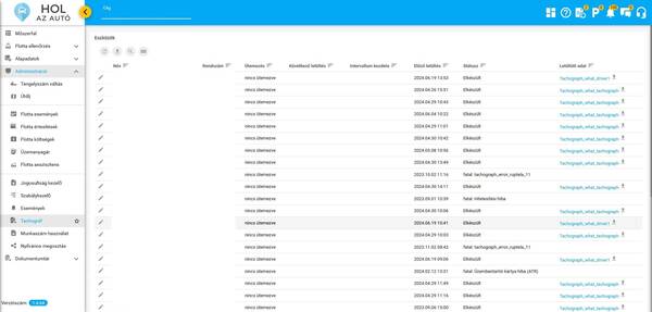 Az adminisztráció modul Tachográf funkciójában a megnyitást követően a tachográfos járműveik listáját találják ügyfeleink. A lista jobb szélén, a lefelé mutató nyíllal jelzett gombra kattintva az utoljára letöltött adatcsomag érhető el, a Dokumentumtár Tachográf menüjében érhetőek el a korábbi letöltések.