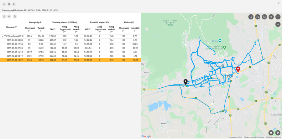 Az eredmény megjelenítésért egy lenyitható táblázat felelős, az üzemanyagfogyasztási adathoz tartozó útvonal kattintásra kirajzolódik a térképen.