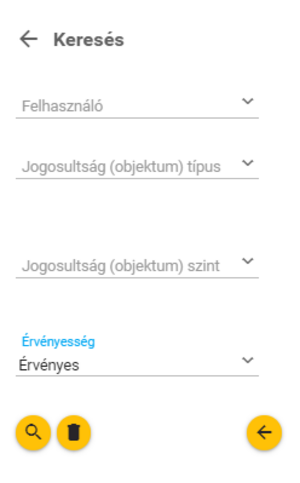 A jogosultságkezelő funkció alapja - a rendszer más funkcióinál már megszokott - szűrhető, sorrendezhető lista. A lista a funkció elindításakor üresen jelenik meg, szükséges valamilyen szűrési szempont beállítása és a szűrés elindítása. Az adatokat az alábbi szempontok alapján lehet szűrni és megjeleníteni:
