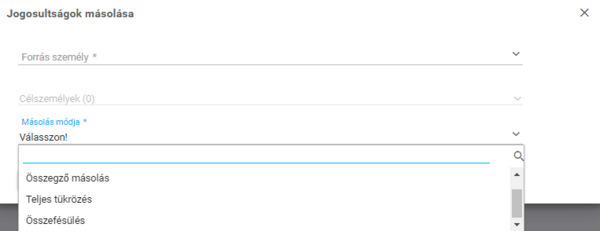 Ennél a funkciónál egy felhasználó komplett jogosultságait lehet egy másik felhasználóhoz másolni. A másolás a listaképernyőről indítható az erre kihelyezett gombról. A gombra kattintva új ablak nyílik meg, ahol a forrás és cél felhasználót, valamint a másolási módot lehet megadni, majd a másolás gombbal indítani. A funkció kritikus változtatásokat csinál, ezért a végrehajtás előtt megerősítő kérdést tesz fel a rendszer. Másolási módok