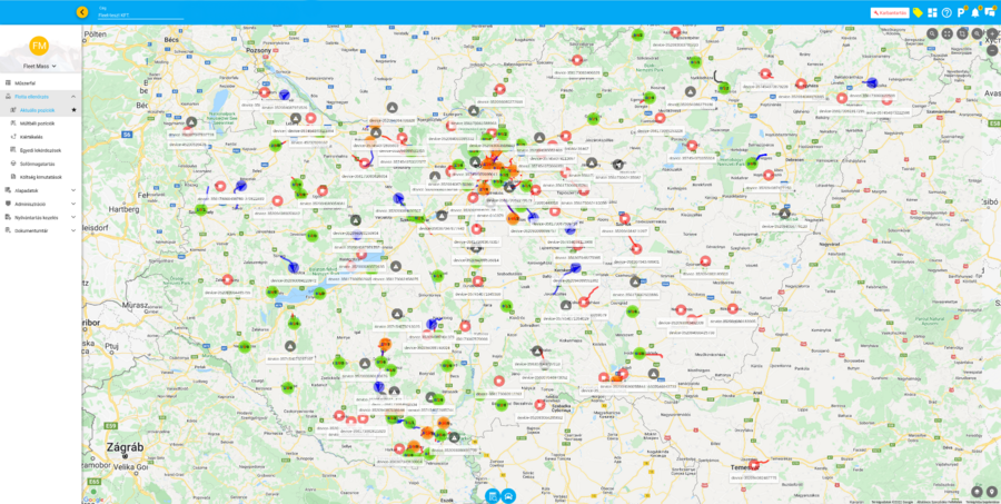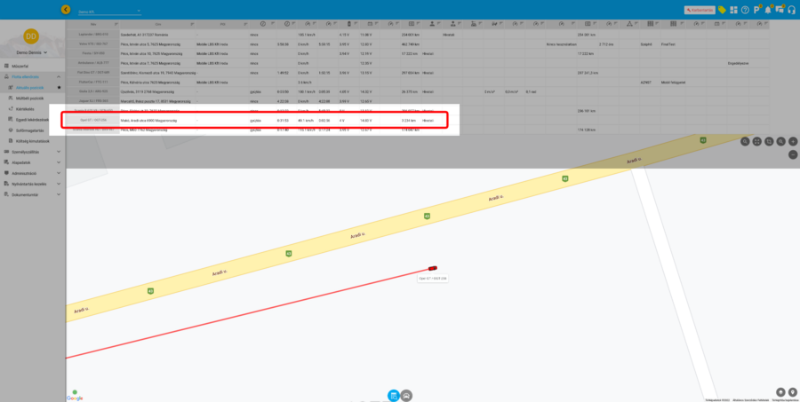 Az eszköz név mellett megtalálható a pillanatnyi tartózkodási hely címe, az Ismert pontok (itt akkor jelenik meg információ, hogyha az eszköz a felhasználó által létrehozott Ismert pontok valamelyikében tartózkodik), az eszköz által beküldött utolsó sebesség adat, a gyújtás, és még sok egyéb információ. A térkép az állapottáblában kiválasztott járműre közelít.