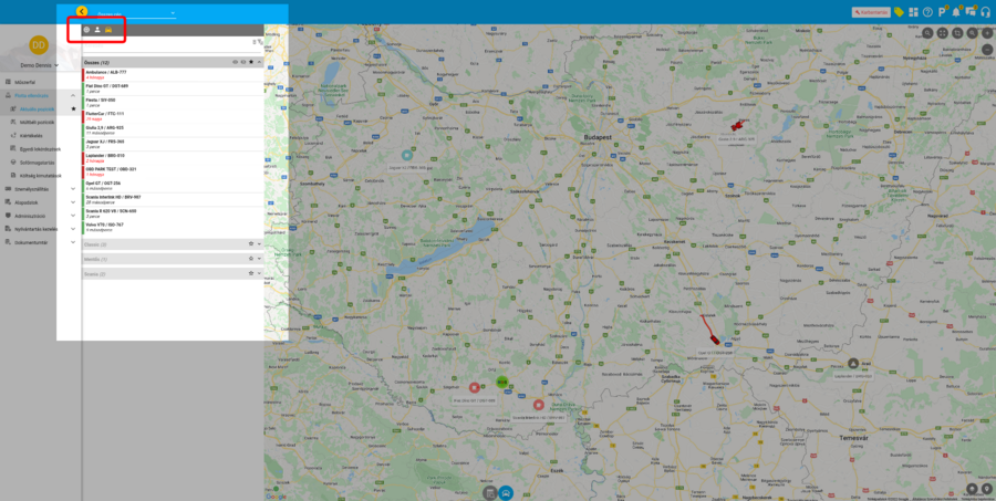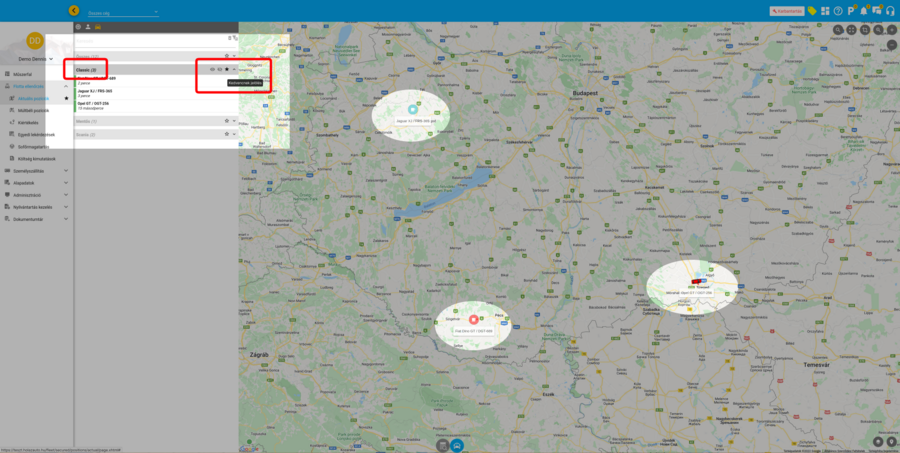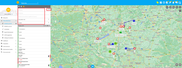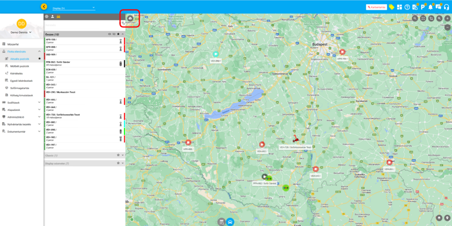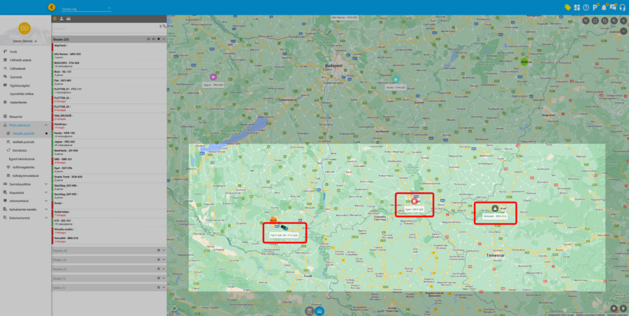 Az Aktuális pozíciók megnyitásakor mindig a kedvencelt csoportban lévő járművek jelennek meg a térképen.