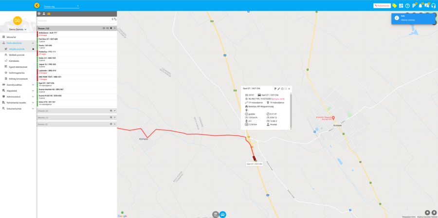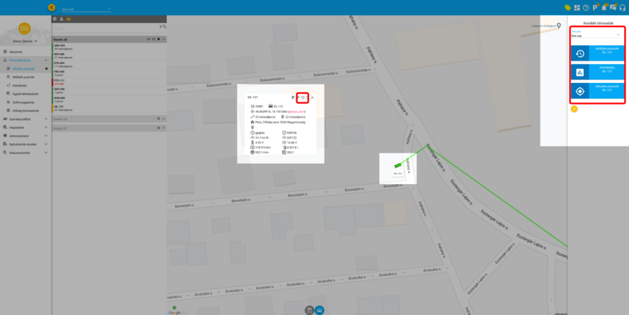 Korábbi pozíciót választva, a térképen a jármű ikonra kattintva megnyíló információs ablakban a jármű aktuális adatai, valamint az ablak jobb felső sarkában a korábbi pozíciókba navigáló ikon található, amellyel Múltbéli pozíciók és a Kiértékelés funkciókba juthatunk egy kattintással, illetve az aktuális pozíciók felületén a megjelenítést az adott eszközre szűkíti le.