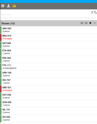 Azok az eszközök amelyek kevesebb mint 60 perce nem küldenek adatot, a listában és a térképen is piros színnel jelöltek.
