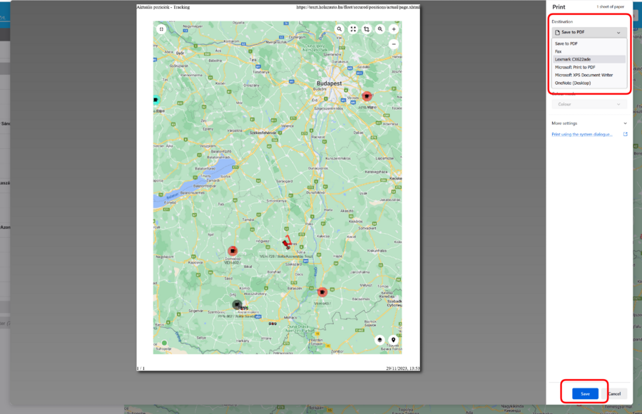 Az aktuális pozíciók térképes felületének bal felső sarkában elhelyezett nyomtató ikonra kattintva megjelenik a térkép nyomtatható előnézete.