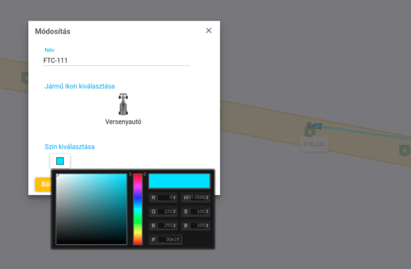 Hogy a szolgáltatásunkat minél inkább saját igényeidre tudd szabni, az alapértelmezett beállítás helyett egyéni jármű, eszköz és személy ikont és színt is választhatsz. Kattints a kiválasztott eszköz adatlapjának fejlécén elhelyezett ceruzára, a megnyíló ablakban találod a beállításokat.