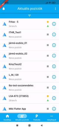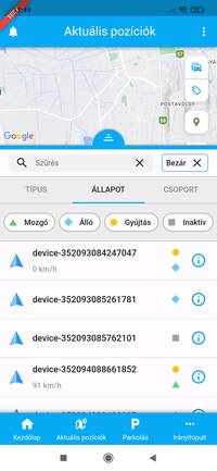 A webes felülettel megegyező módon a mobilalkalmazásban is elérhető az eszköz, a jármű és a személy (azonosított sofőrök) típusok megjelenítése. A listában és a térképen megjelenő tartalmat nem csak típus, hanem állapot és csoportba rendezés alapján is szűrheted.