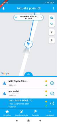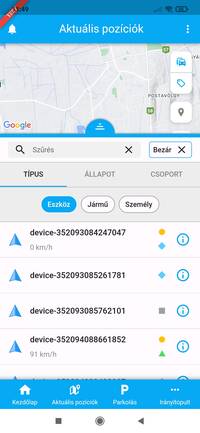 Az aktuális pozíciók felületén az általad megfigyelt eszközök valós idejű pozíciója, és a beküldött adatok követhetőek nyomon. A képernyő felső részén a térképes megjelenítés kapott helyet, amely alatt az eszközök listáját találod.