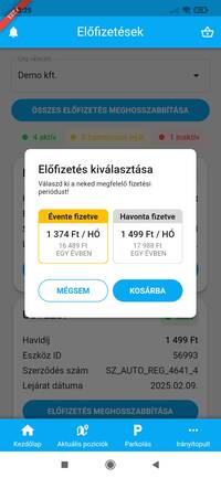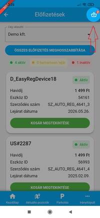 A kosár ikonra koppintva, vagy a „kosár megtekintése” gombra koppintva az alkalmazás átnavigál a kosár felületére. Itt láthatsz minden előfizetést, amit szeretnél igényelni vagy meghosszabbítani, az árukat, a nevüket, illetve hogy milyen szolgáltatásra fizetsz elő. Az eltávolítás gomb segítségével törölni lehet a kosárból a tételeket.