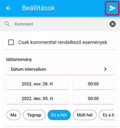 A felület betöltésekor alapértelmezetten az aktuális héten történt eseményeket jeleníti meg az alkalmazás. Az események közötti keresés feltételeit a képernyő jobb felső sarkában, a fejléc jobb szélén található nagyítóra kattintva megnyíló felületen állíthatod be.