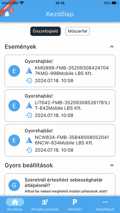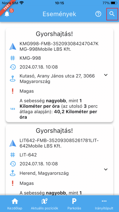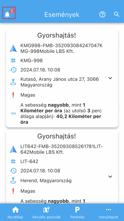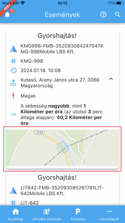 A részletes nézetet tartalmazó kártya alján továbbá láthatjuk az értesítés keletkezésekor meghatározott tartózkodási helyét az eszköznek, járműnek.