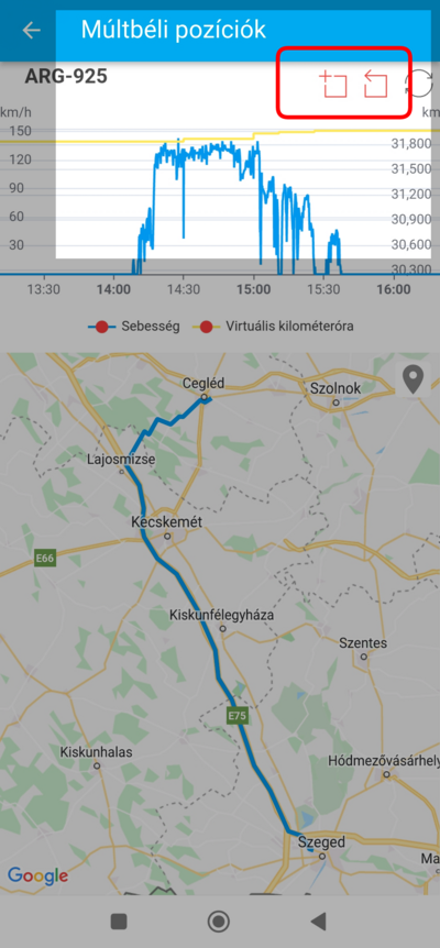 A grafikonban végrehajtott nagyításokat lépésenként fordított sorrendben is el lehet végezni a + gombtól jobbra elhelyezett, nyíllal jelölt gombra koppintva, ekkor mindig egy nagyítással korábbi állapotba lépünk vissza . A grafikont és térképet a jobb felső sarokban található frissítés gombra koppintva alaphelyzetbe állíthatod, ilyenkor az eredetileg lekérdezett eredményt töltöd vissza.