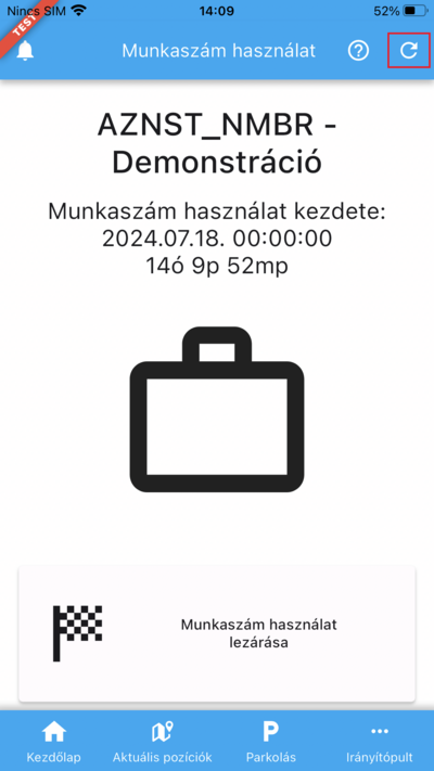Az alkalmazás rendszeresen ellenőrzi az adott munkaszám használat státuszát, ugyanis a munkaszám használatokat a webes felületen is módosíthatod. Amennyiben a használat a webes applikációban lezárásra került, úgy ezt a változást az alkalmazás szinkronizálja. Az offline működés is megoldott a mobil kliensen, az offline állapotban létrehozott használatot rendszerünk szinkronizálja, amint helyreáll az adatkapcsolat. Bár az alkalmazás rendszeresen ellenőrzi a használat státuszát, a fejléc jobb szélén elhelyezett gombra koppintva manuálisan is frissítheted a használat állapotát.