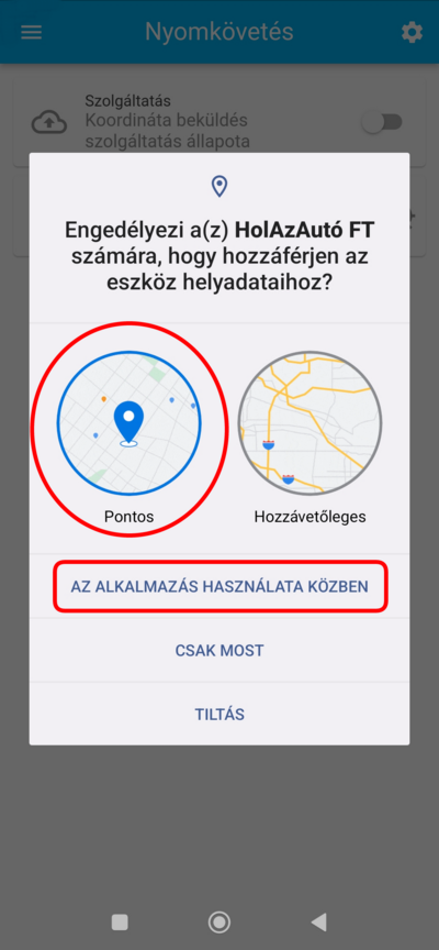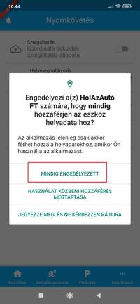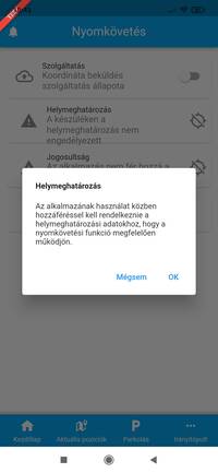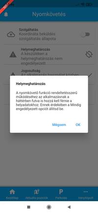 Ezután az alkalmazás bekéri az állandó helyadat használati engedélyt, amely akkor is biztosítja a nyomkövető funkció rendeltetésszerű működését, amikor az alkalmazás a háttérben fut.