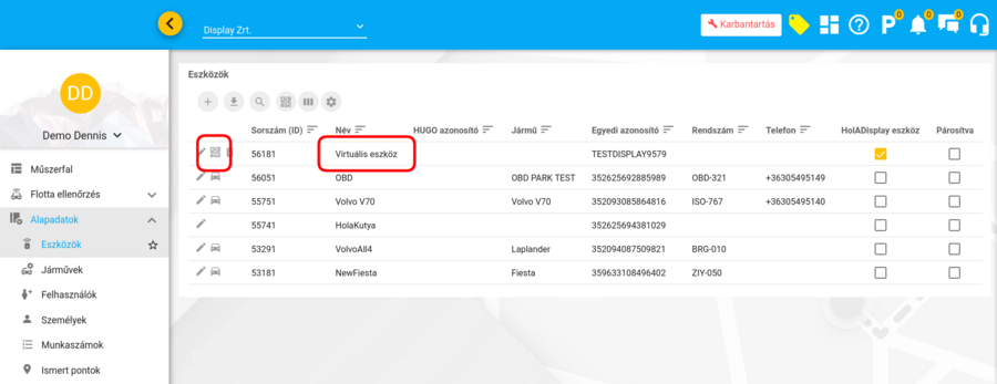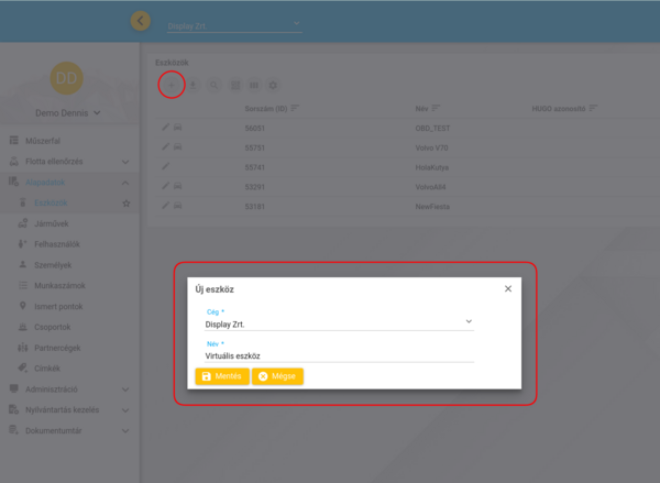 A párosítandó virtuális eszközt a webes alkalmazásban, az alapadatok menü eszközök almenüjében kell létrehoznod, a lista bal felső sarka felett elhelyezett + gombra kattintva.