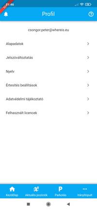 A profil menü felületén, a fejléc alatt a bejelentkezett felhasználó email címe látható. Az email cím alatt a következő funkciók és információk találhatók: